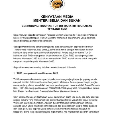 BERNAMA Retweeted KBS's Tweet: Kenyataan media oleh Menteri Belia dan Sukan, YB @Khairykj berhubung tuduhan Tun Dr Mahathir Mohamad tentang TN50